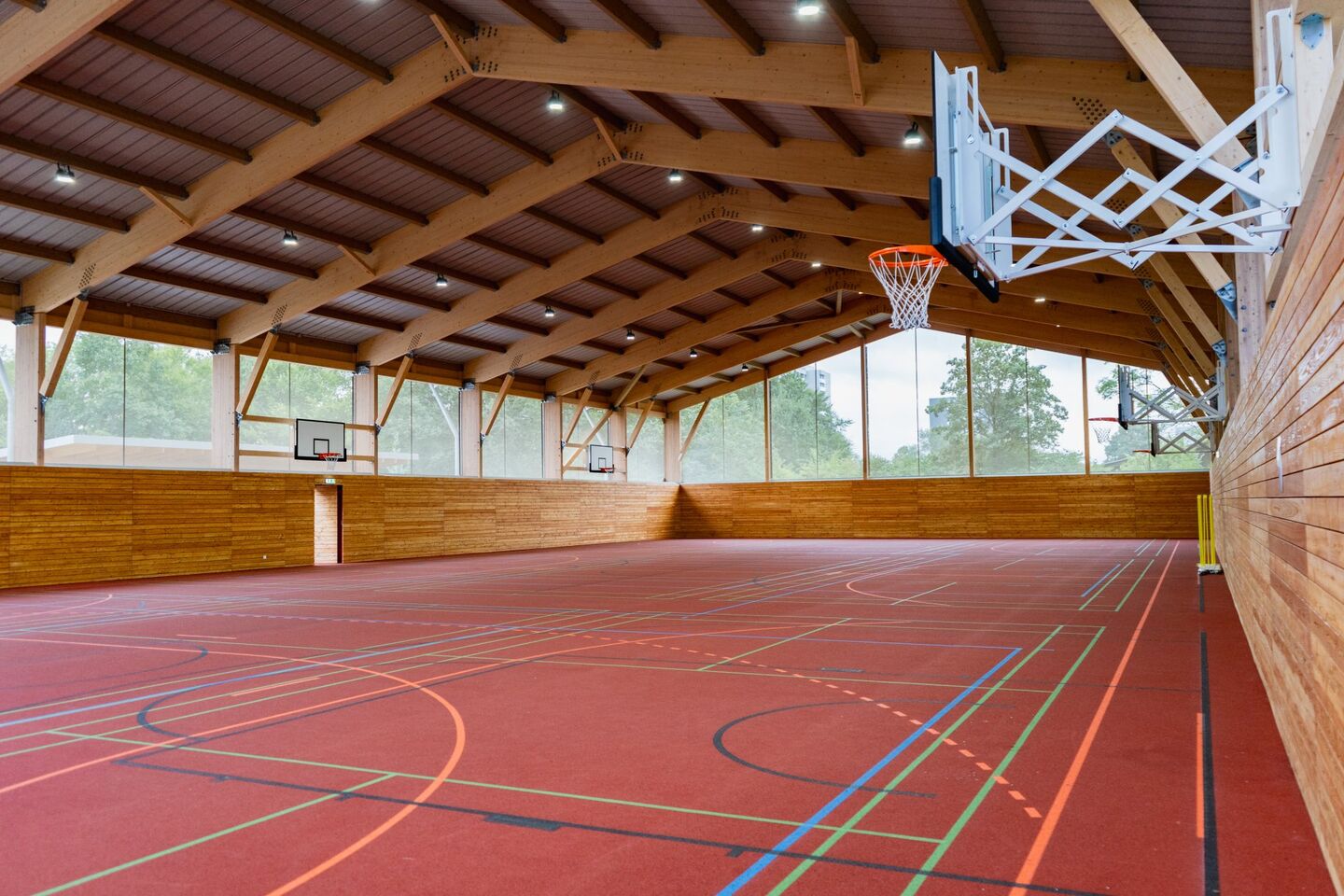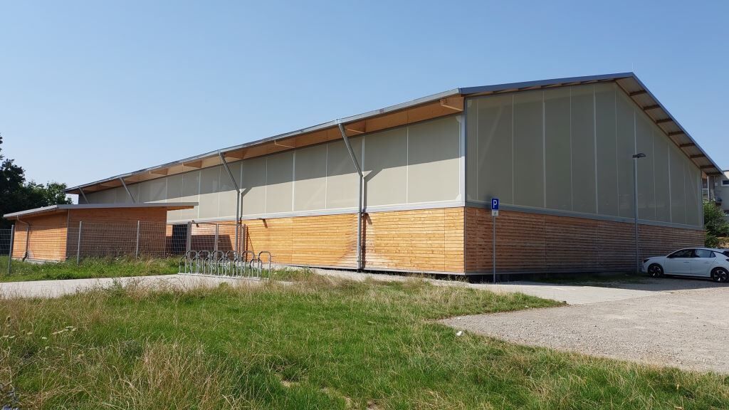 Halle, Nebengebäude und die umlaufende Prallwand sind in Holz konstruiert, lediglich die Fundamente und Bodenplatte sind massiv aus Stahlbeton. Auf dem Trapezblechdach findet eine große PV-Anlage mit 237 KWp Platz. Die Flächen zwischen Prallwand und Dach sind mit einer mikroperforierten Membran geschlossen, die luftdurchlässig ist, aber weitgehend Regen, Schnee und Laub abhält.